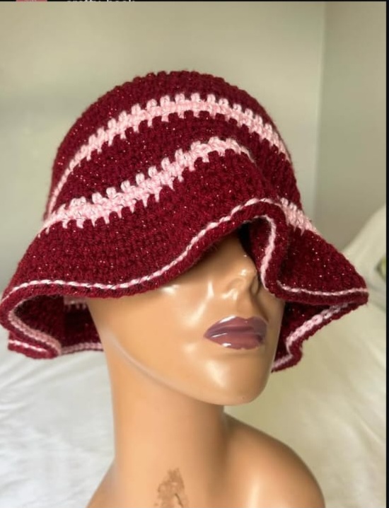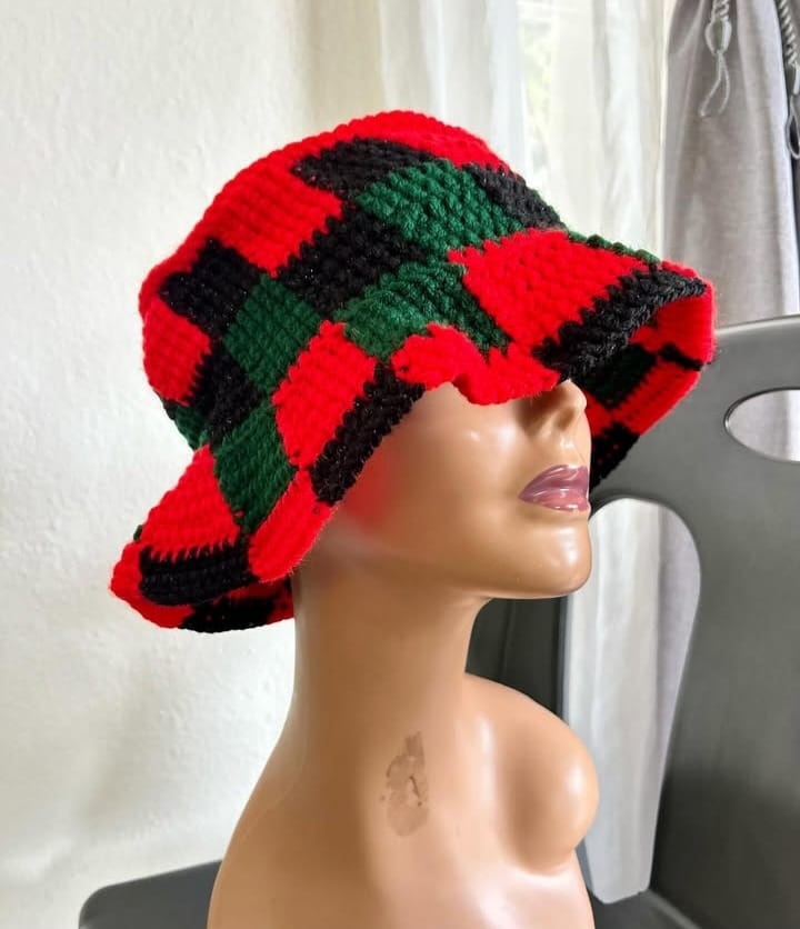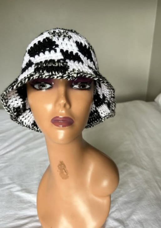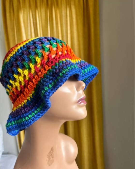 Handmade crochet bucket hat, trendy design, comfortable fit, durable yarn, available in custom colours.