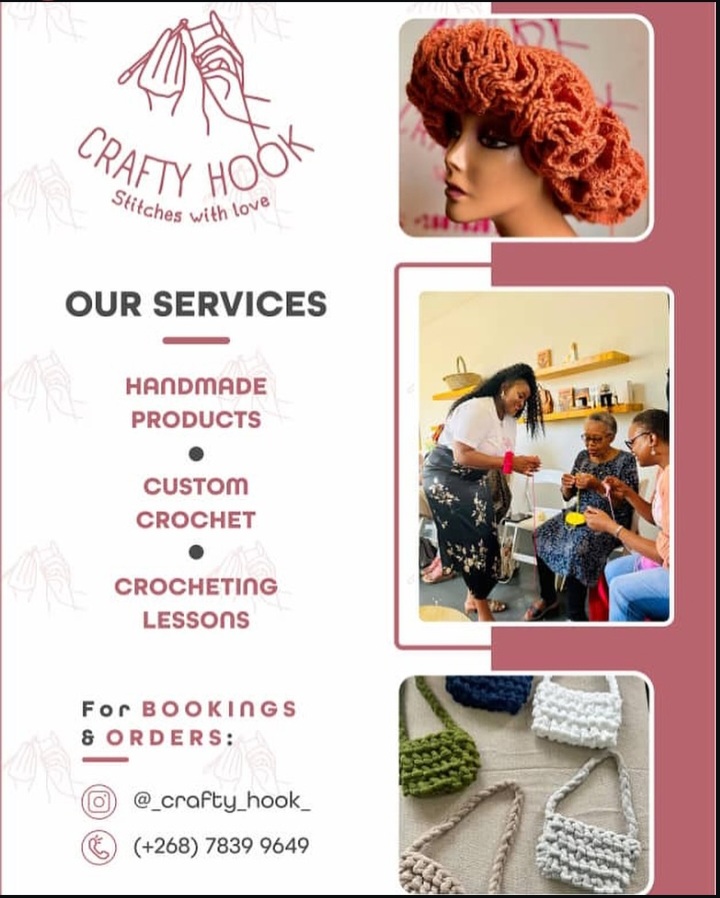 CraftyHook is a small handmade crochet brand based in Eswatini, dedicated to creating beautiful, high-quality crochet products made with care and creativity. Founded by a passionate young entrepreneur, CraftyHook specializes in handmade accessories, custom crochet pieces, and beginner-friendly crochet lessons for individuals who want to learn the craft.